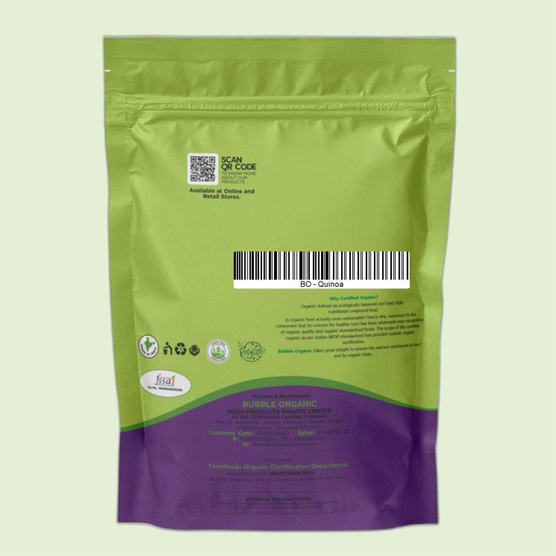 Bubble Organic Quinoa are daily need products filled up with goodness of natural taste, enhance for a healthy and active lifestyle, with amazing flavor in Indian cuisine. Our vision is to provide the highest quality of organic products for genuine price. Our products are special because there is no refine or products gone under polishing process and no addition of artificial aroma. We take great delight to ensure the nutrient substance in food and its organic taste. Real organic products undergo traditional process of harvest where farmer has the practices of making the grains, pulses, rise etc., to dry directly under sunlight and processing by beating the grains for removing the pods by cracking and scratching for removing husk and outer covering, cleaning by natural way for removing soil and stone or winnowing method used to remove skins. Our products are made from premium quality; undergo austere and accurate laboratory ordeal to meet FSSAI food safety standard norm. Our products are packed in good hygienic condition.