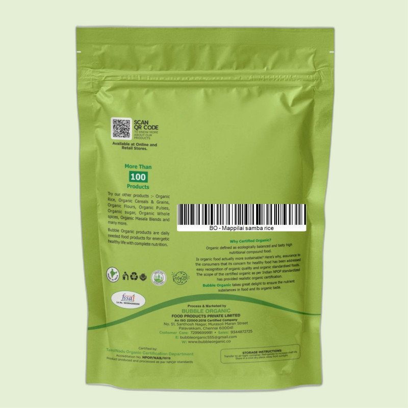 Bubble Organic Mappillai samba rice is a good source of energy. Mappilai samba red rice Strengthens muscles and nerves. It Contains pro-anthocyanidins. Mappillai samba rice low in salt this rice is recommended for people of all ages.