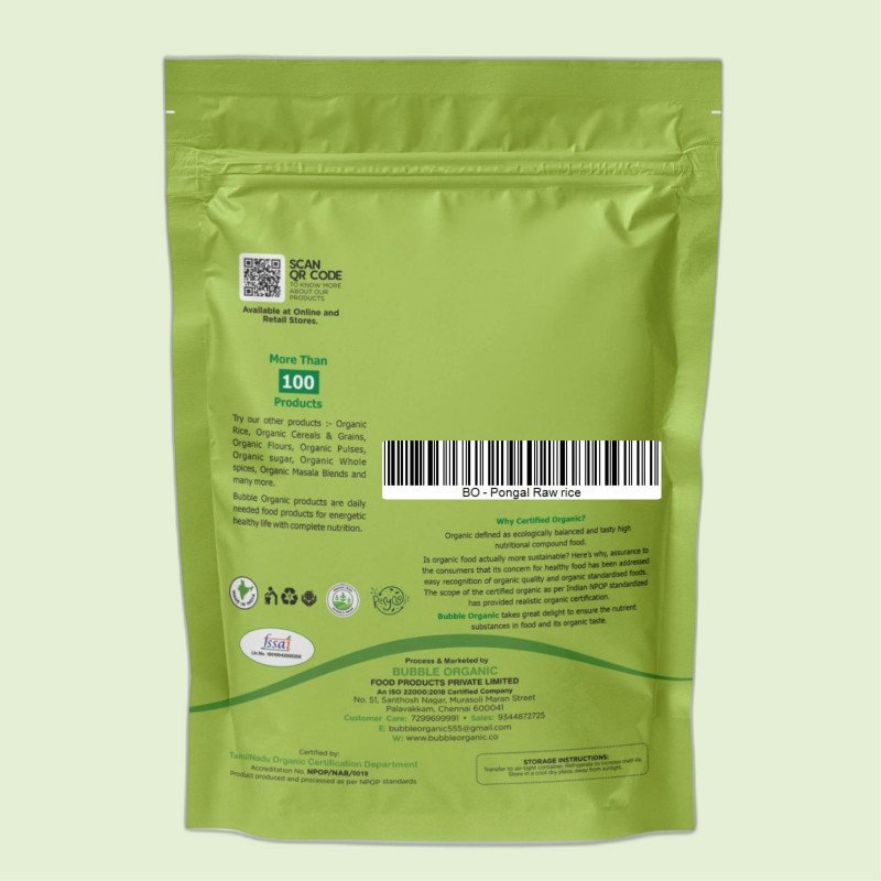 Bubble Organic Pongal Raw Rice is high-quality rice it is unpolished, preserving its natural nutrients and rich flavor. This rice is known for its soft texture and unique aroma, making it an excellent choice for a wholesome and nutritious meal. Real organic products undergo traditional process of harvest where farmer has the practices of making the grains, pulses, rise etc., to dry directly under sunlight and processing by beating the grains for removing the pods by cracking and scratching for removing husk and outer covering, cleaning by natural way for removing soil and stone or winnowing method used to remove skins. Our products are made from premium quality; undergo austere and accurate laboratory ordeal to meet FSSAI food safety standard norm. Our products are packed in good hygienic condition.